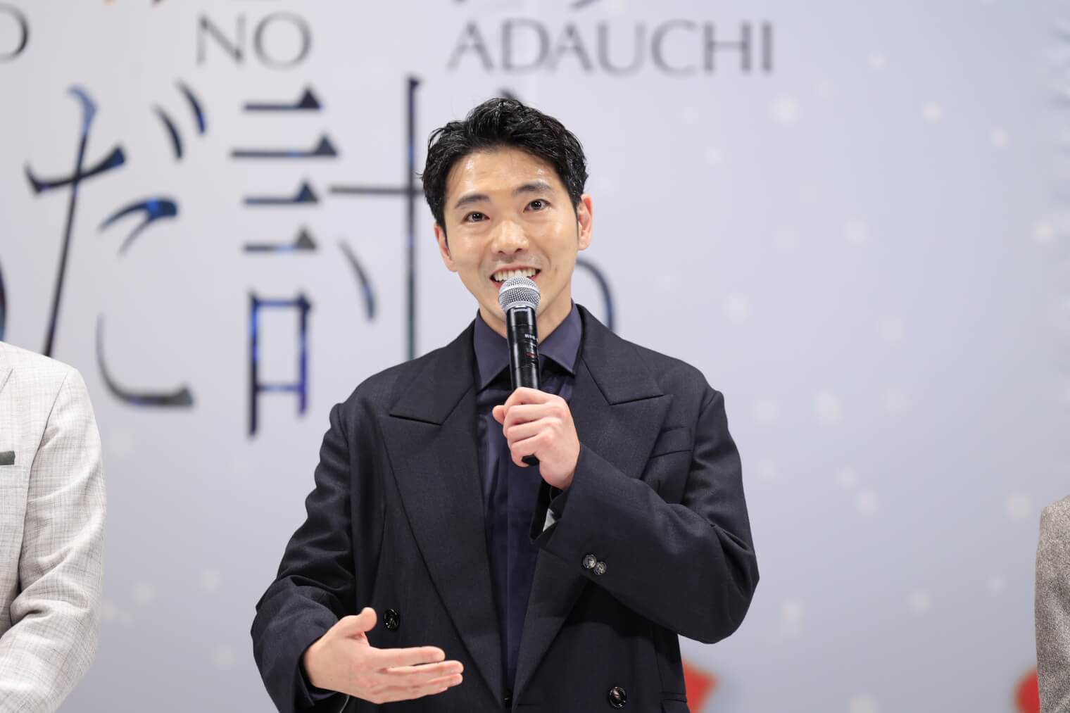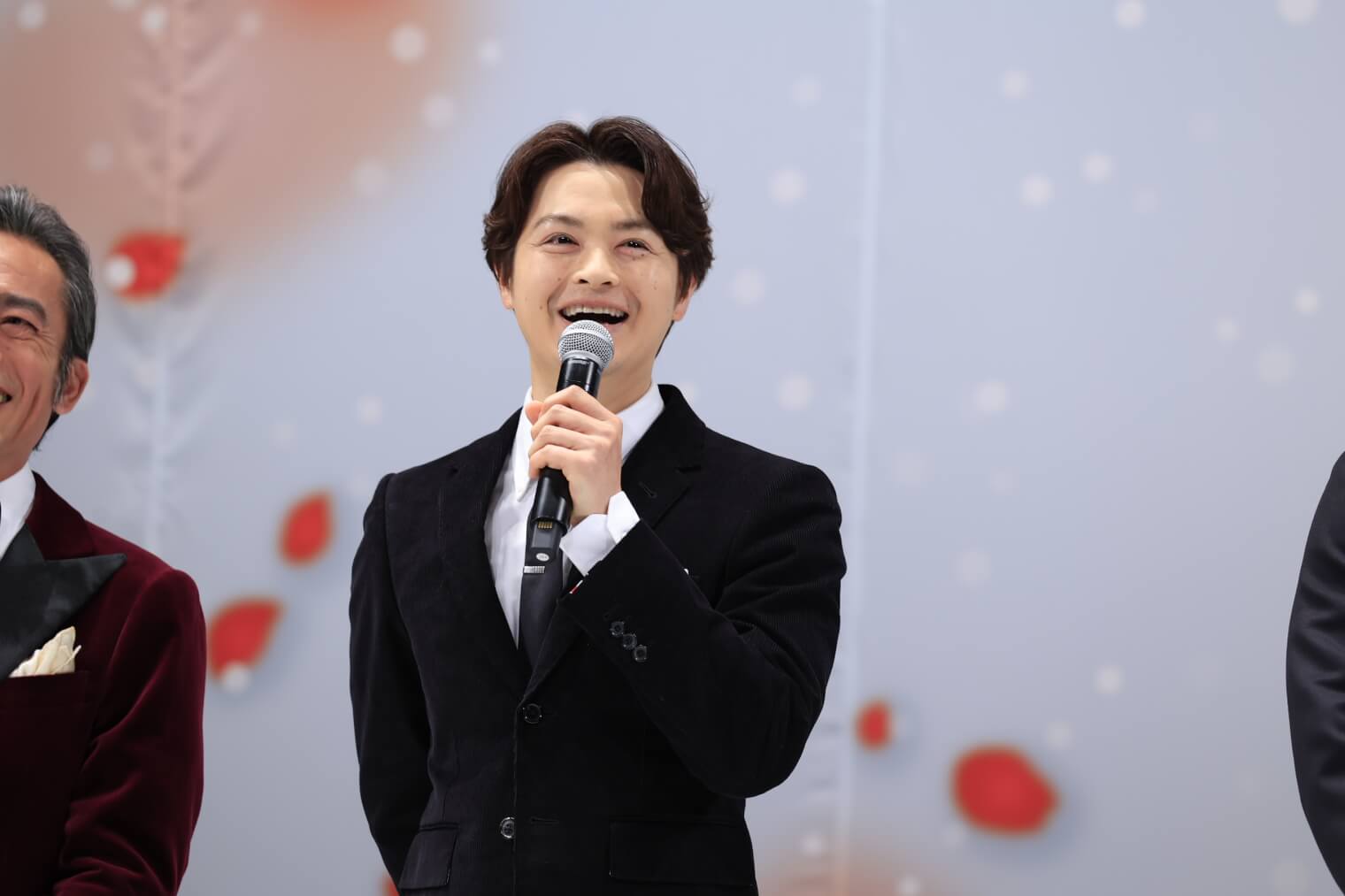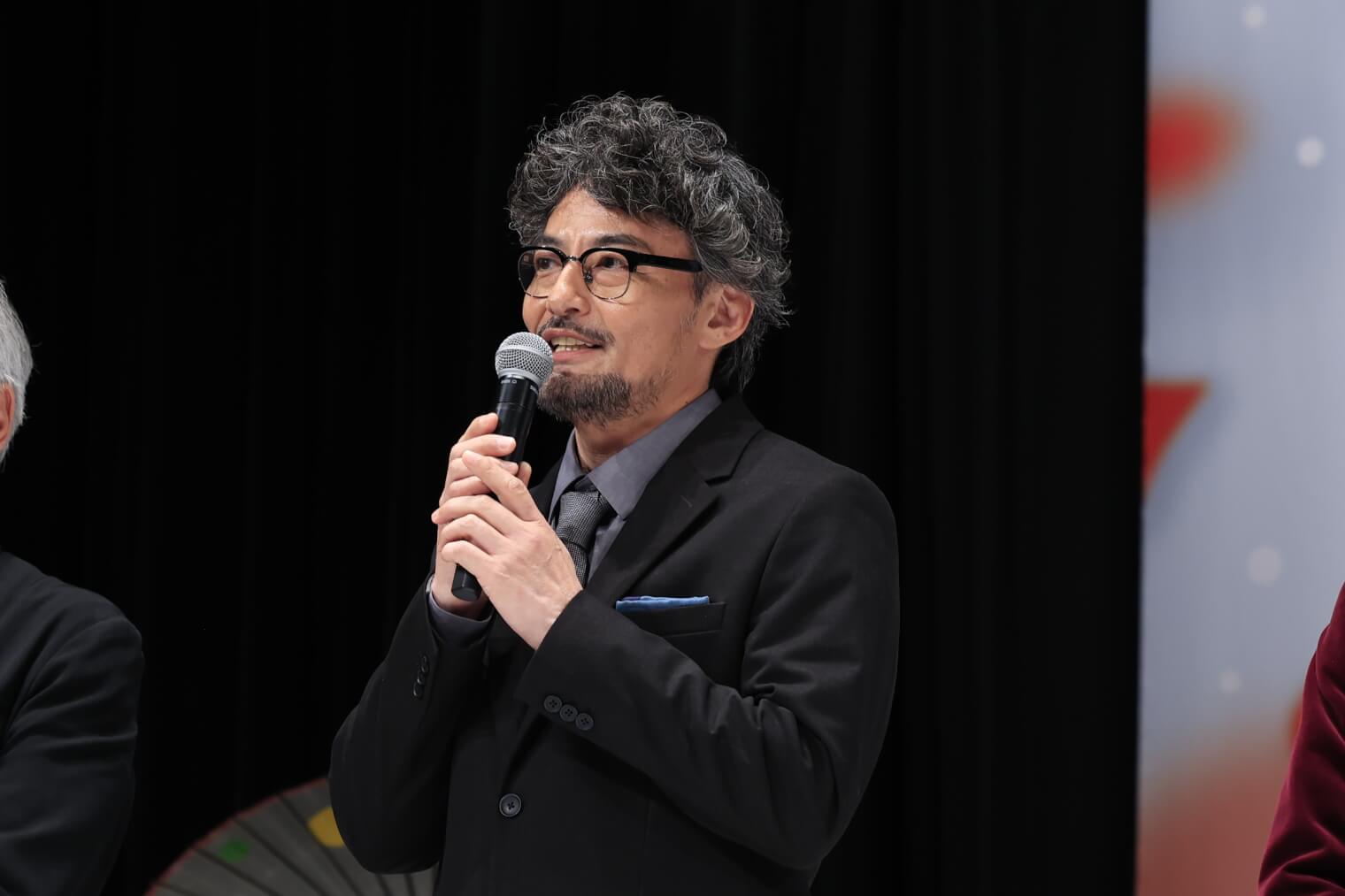 巧みな口上で客を呼び込む木戸芸者・一八役の瀬戸康史は「まだ話せないことも多いですが、優しさに溢れた作品。今日は楽しんでいってください」と語り、立廻りや殺陣を担う立師・相良与三郎役の滝藤賢一は「寒いですが、映画を観て心が温まって帰ってもらえたら」と観客を気遣った。元女形で衣裳方の芳澤ほたる役の高橋和也は「美しい映像で、あっという間の時間になると思います」と見どころをアピール。続いて、言葉少ない小道具方・久蔵役の正名僕蔵が「まさにドリームチーム。源監督と皆さんのおかげで、私も嘘みたいにいい芝居をしています」と語ると、会場には笑いが起こった。