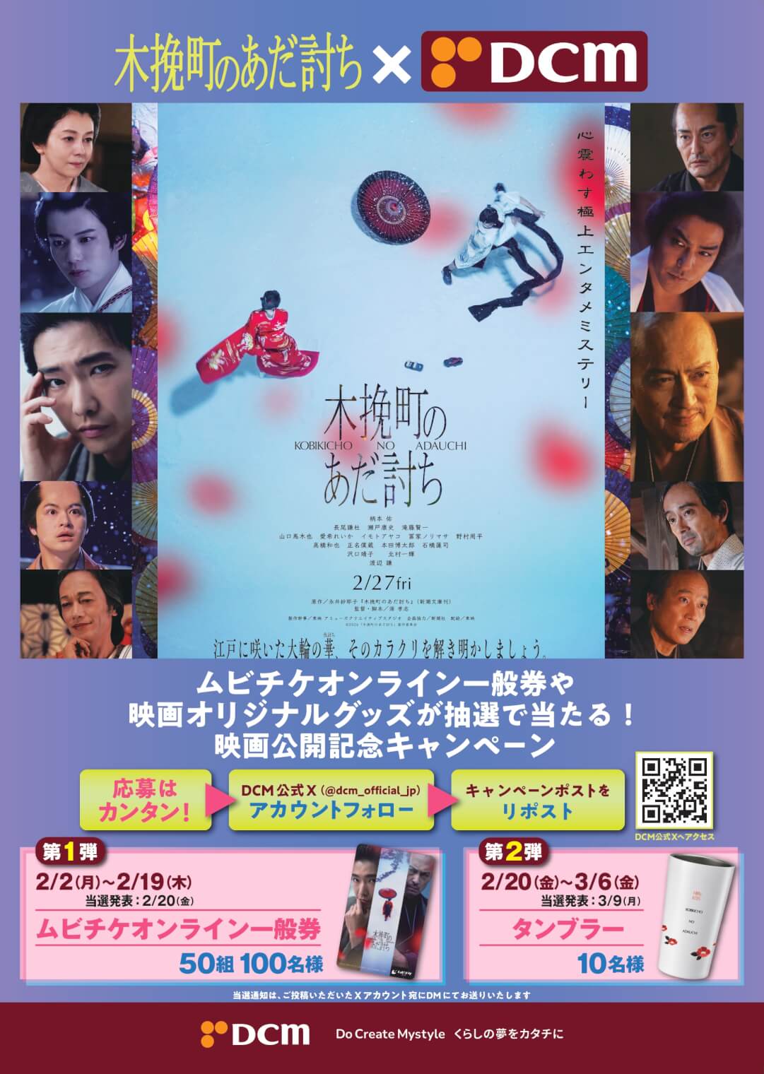 DCMの公式Xアカウントをフォローし、キャンペーンポストをリポストした方に抽選でムビチケオンライン一般券を50組100名様、タンブラーを10名様にプレゼントいたします。応募期間などの詳細は下記をご確認ください。