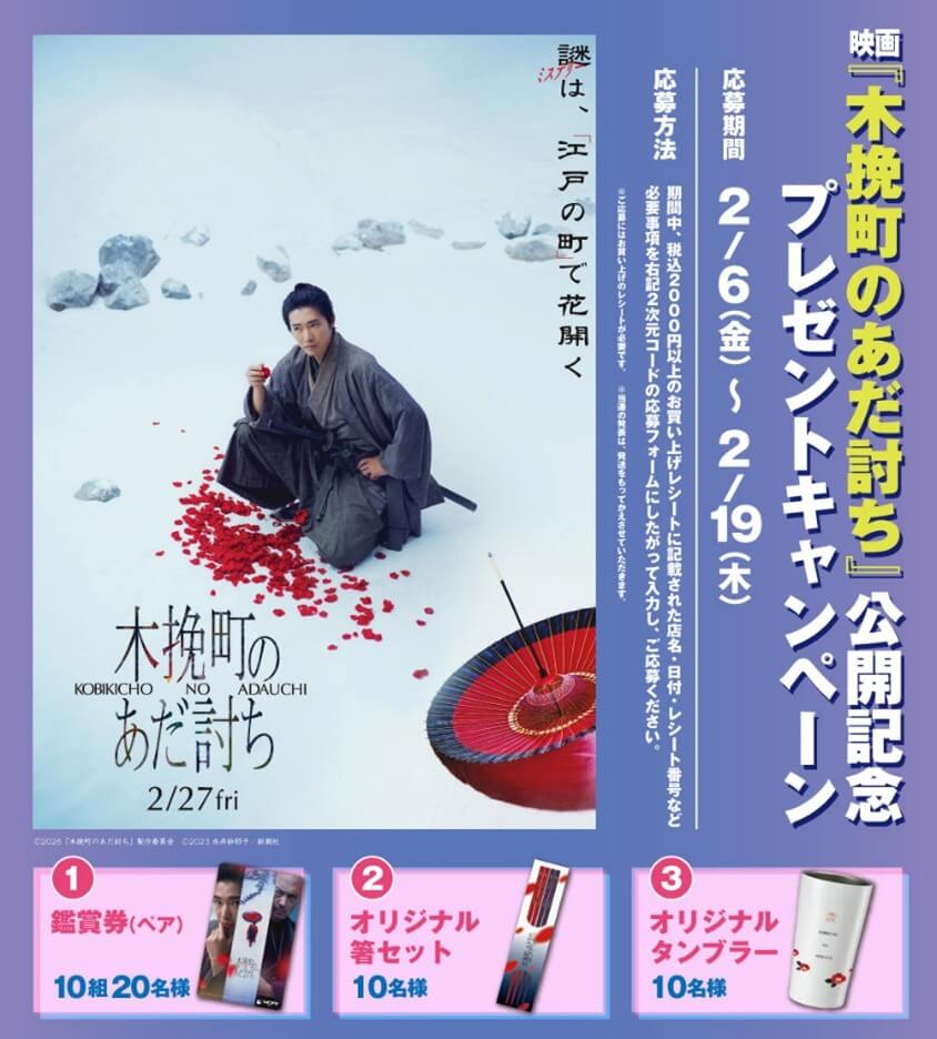期間中、ドラッグスギヤマで2,000円以上お買い上げいただき、キャンペーンにご応募いただいたお客様の中から抽選で、映画観賞券(ペア)を10組20名様、オリジナル箸セット、オリジナルタンブラーをそれぞれ10名様にプレゼントいたします!